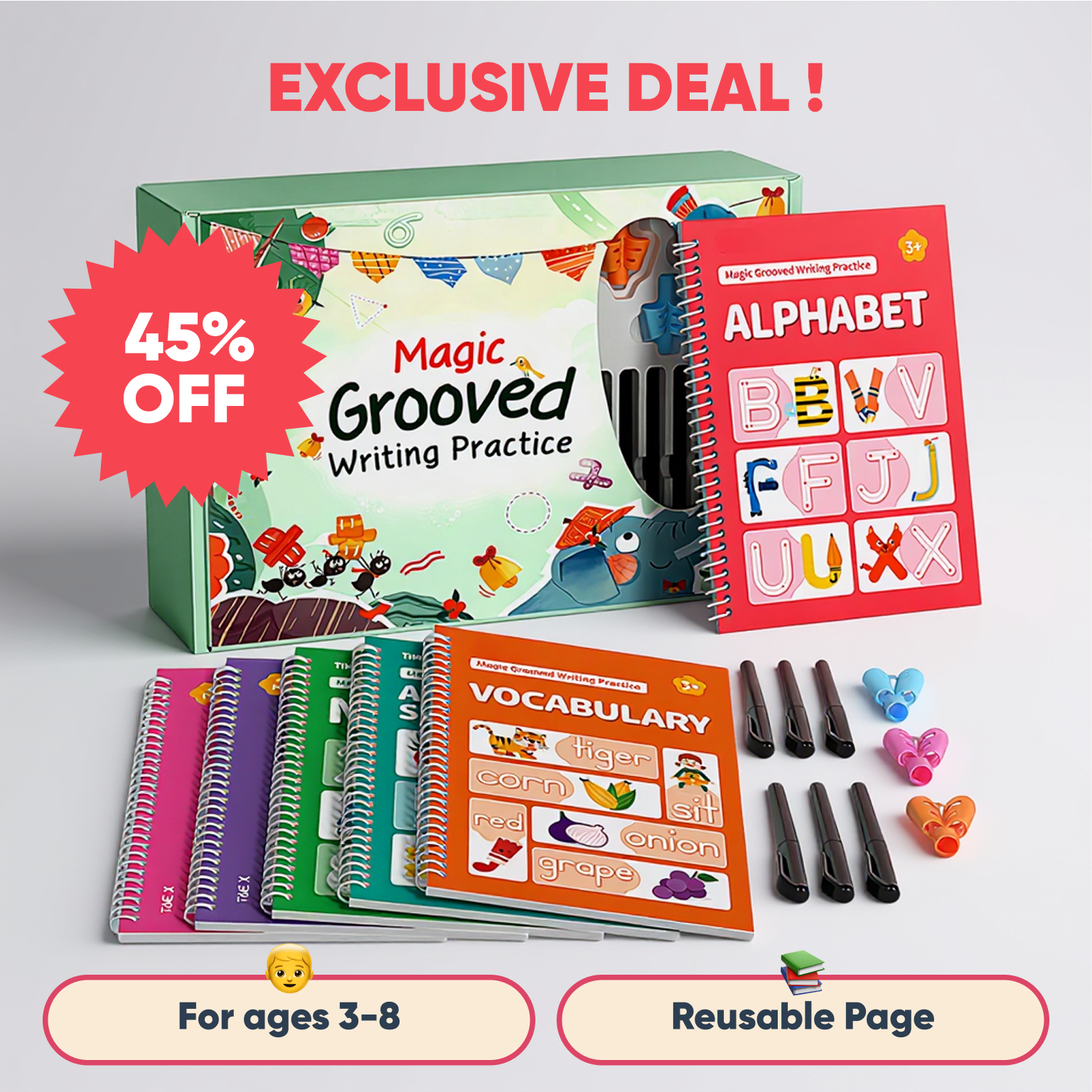 Each MyThinkKit includes 4 reusable magic workbooks (Alphabet, Numbers, Math, and Drawing), 6 magic erasable pens, and 3 ergonomic pen grips. You also get FREE digital bonuses: parent activity guide, progress tracker, and video tutorials (worth £30).